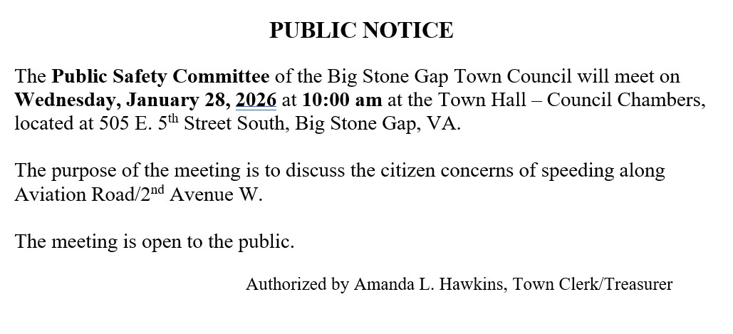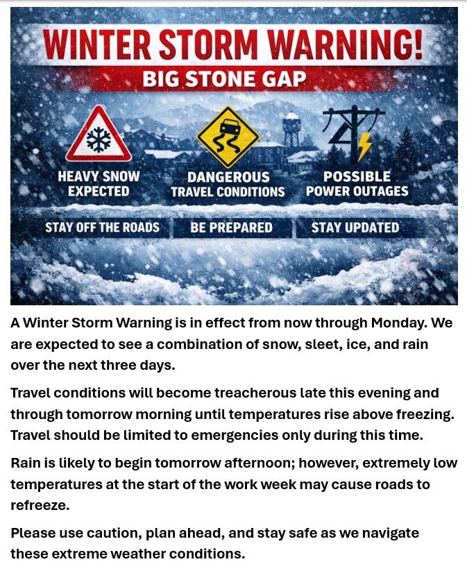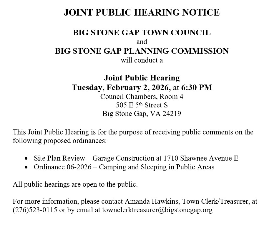 The content, images, graphics, and information shared on this page are created and maintained by the Town of Big Stone Gap for the purpose of informing and engaging our community.